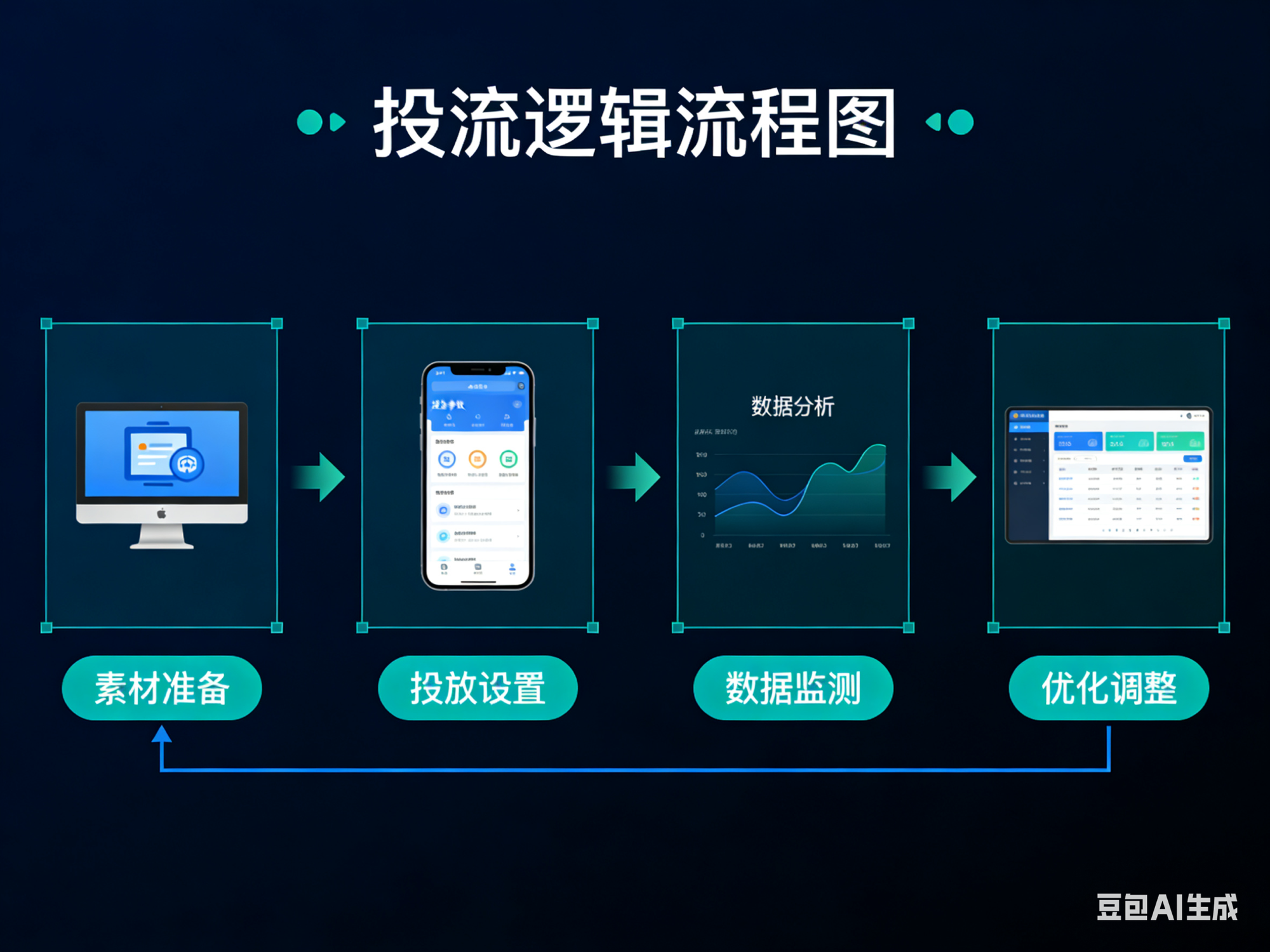 建计划 → 选人群 → 上传视频 → 设预算出价 → 跑量 → 看数据筛素材 → 复制爆款继续跑